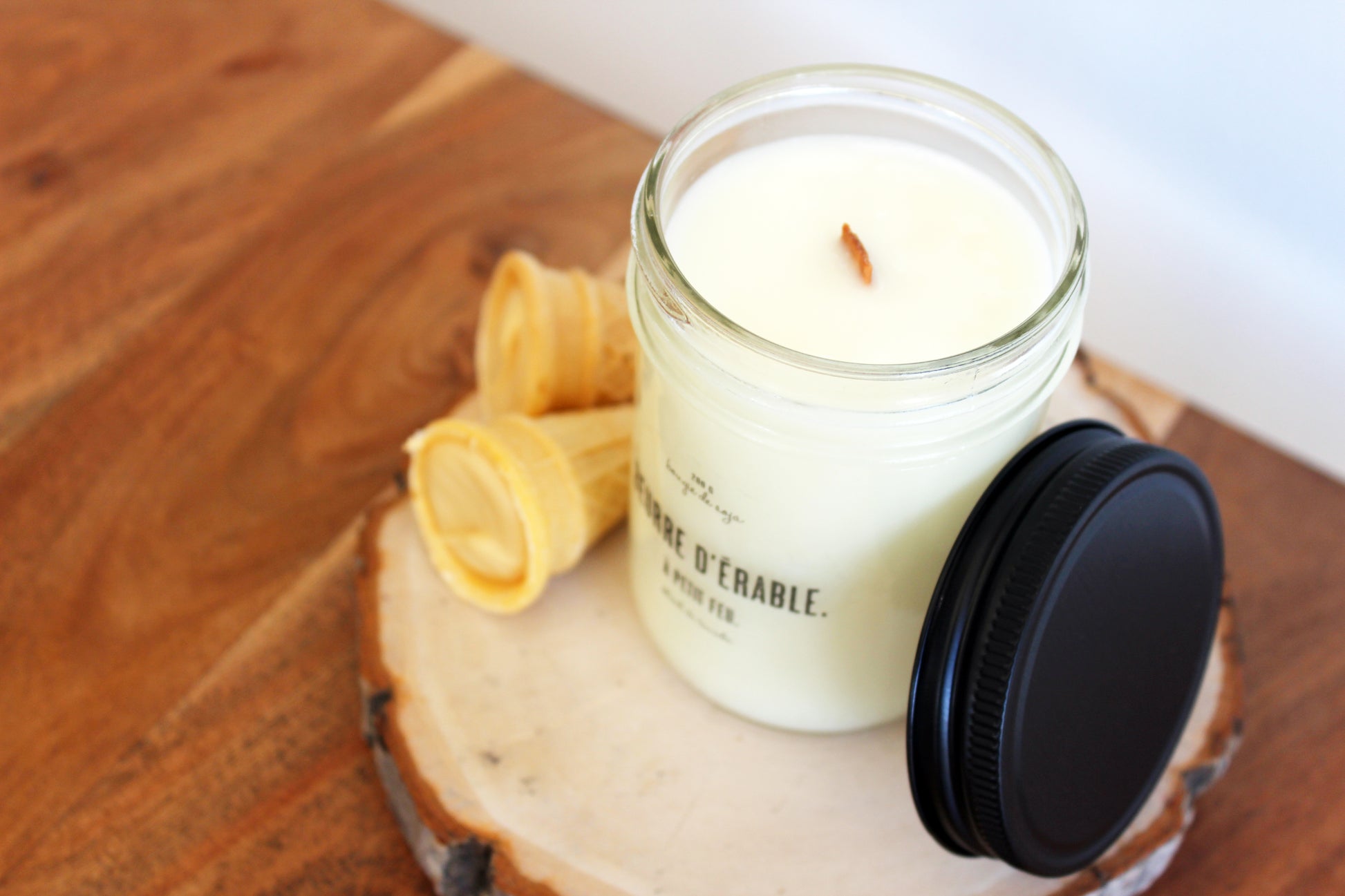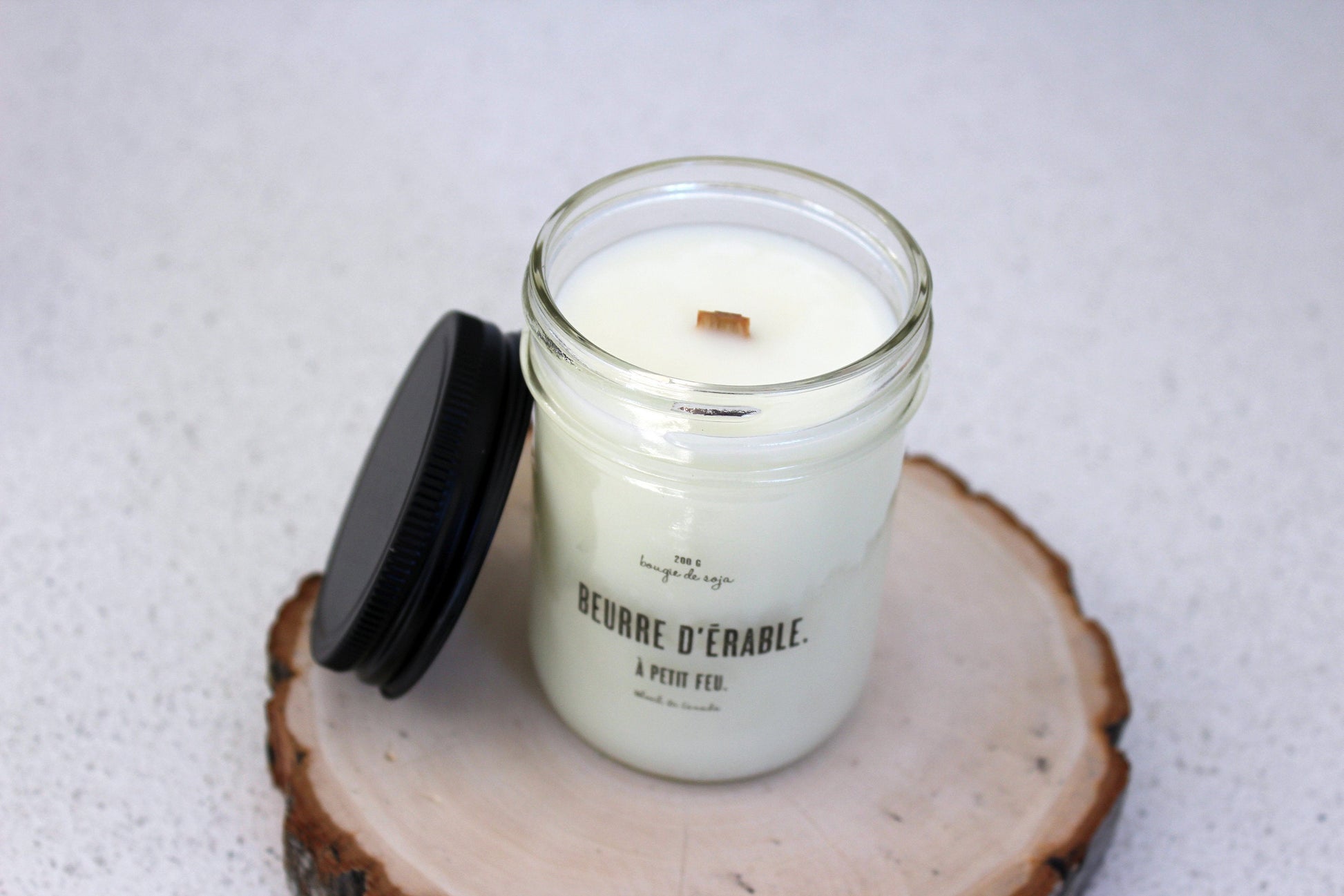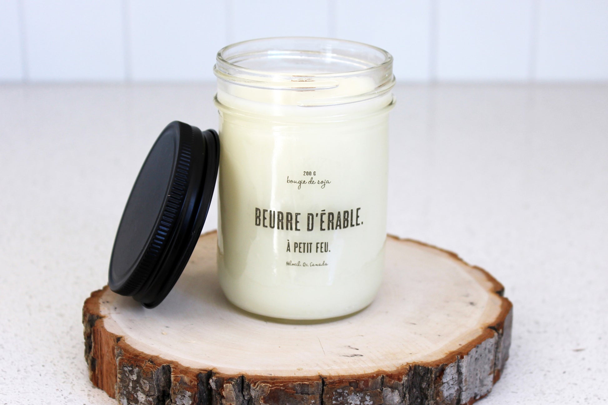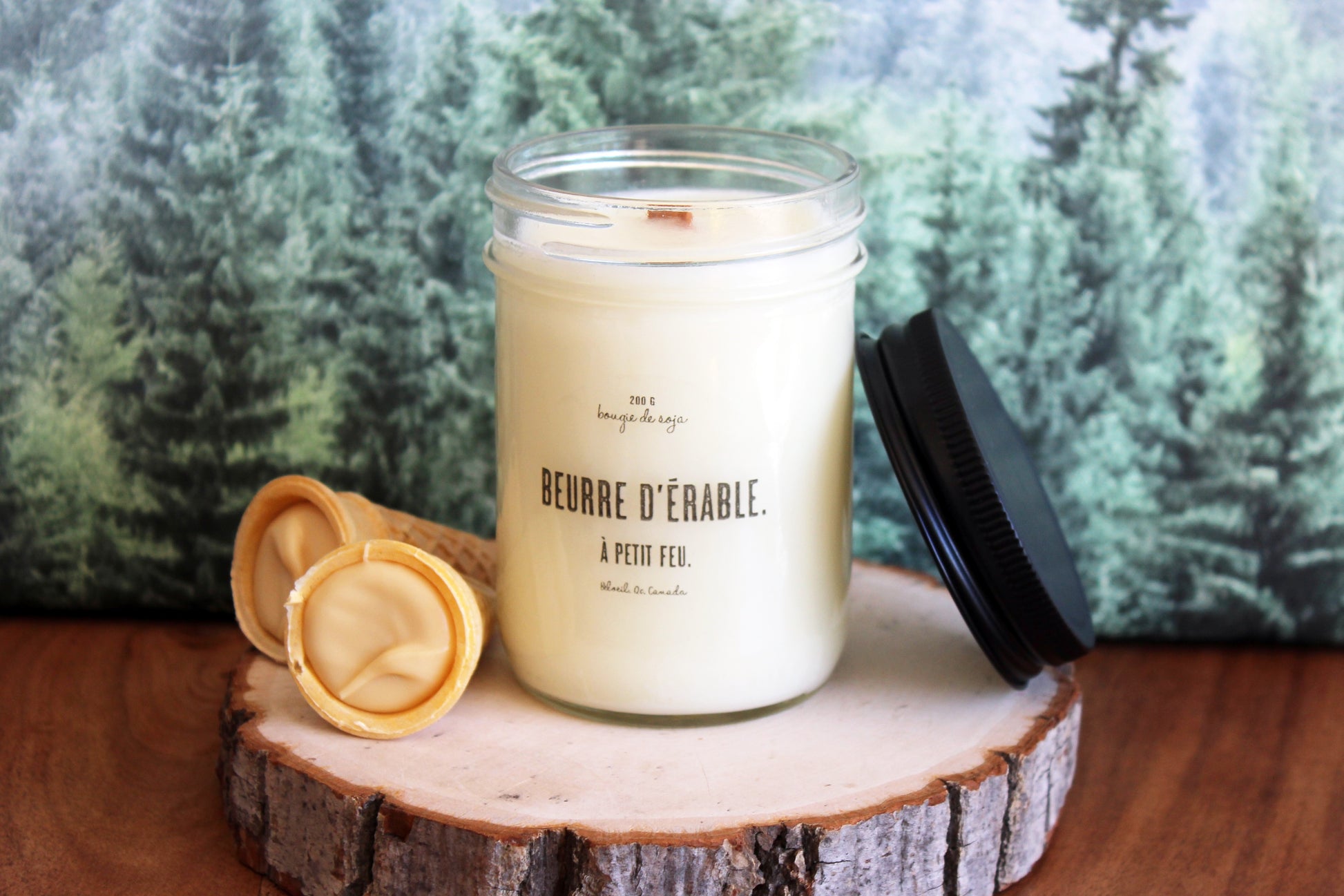 Notre bougie beurre d'érable sent le sirop d’érable et les crêpes au beurre. Un mélange parfait de sucré et de salé qui ravira les amoureux des produits de l'érable. Dans son pot rustique qui s'agencera à tous les décors, cette bougie fait aussi un petit cadeau qui s'offre facilement.