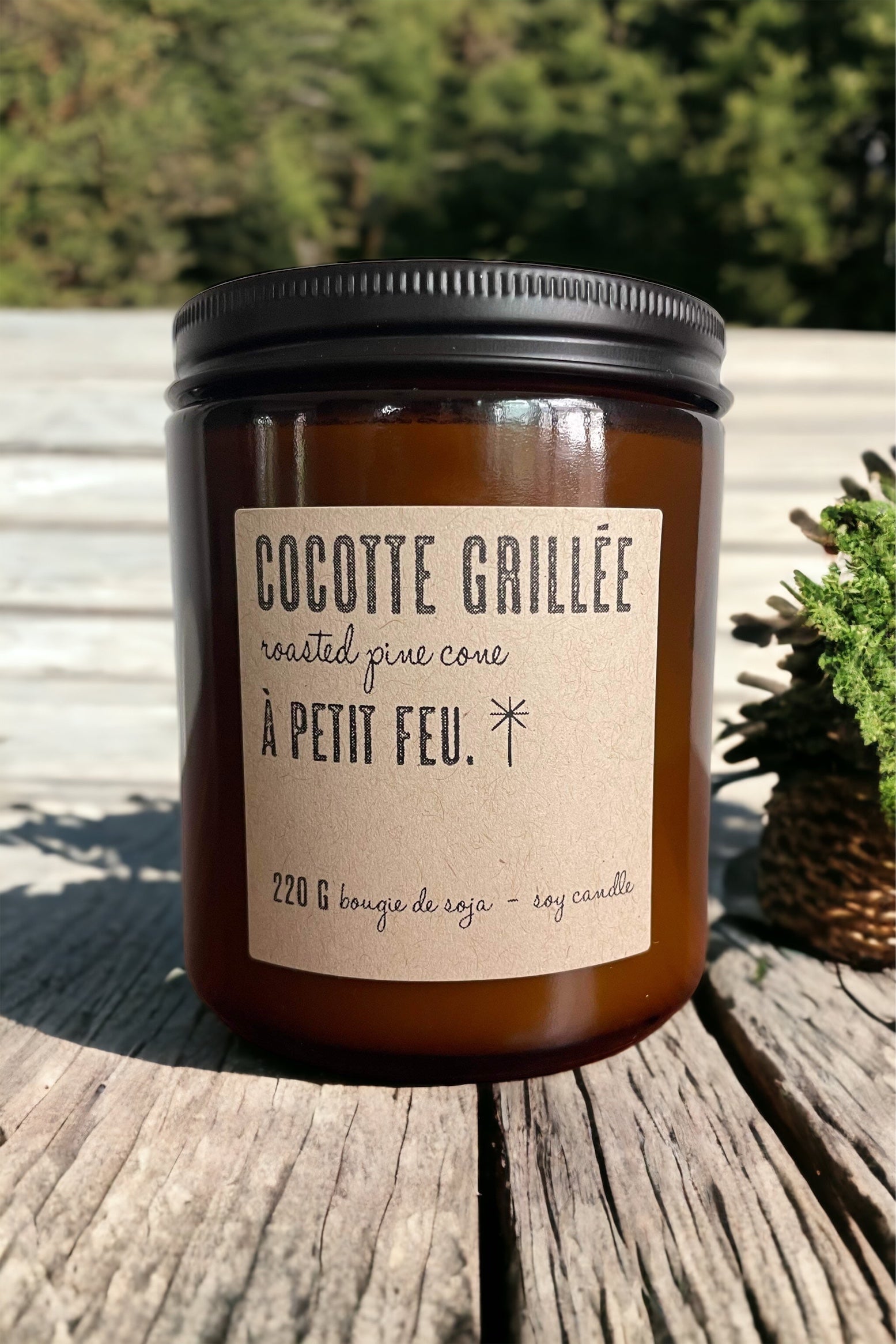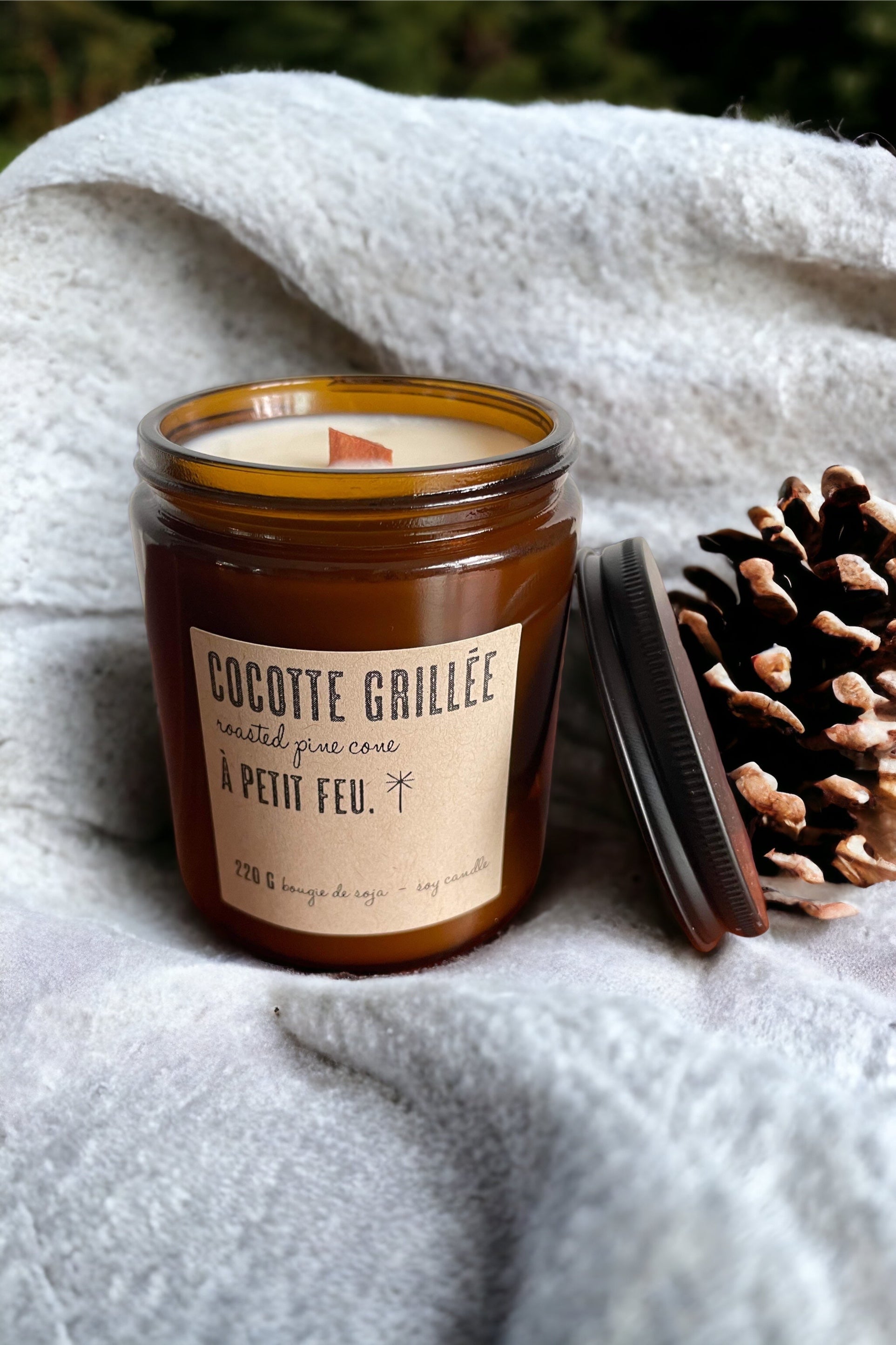 Cette bougie de cire de soja avec mèche de bois crépitante est parfumée avec notre fragrance COCOTTE GRILLÉE.