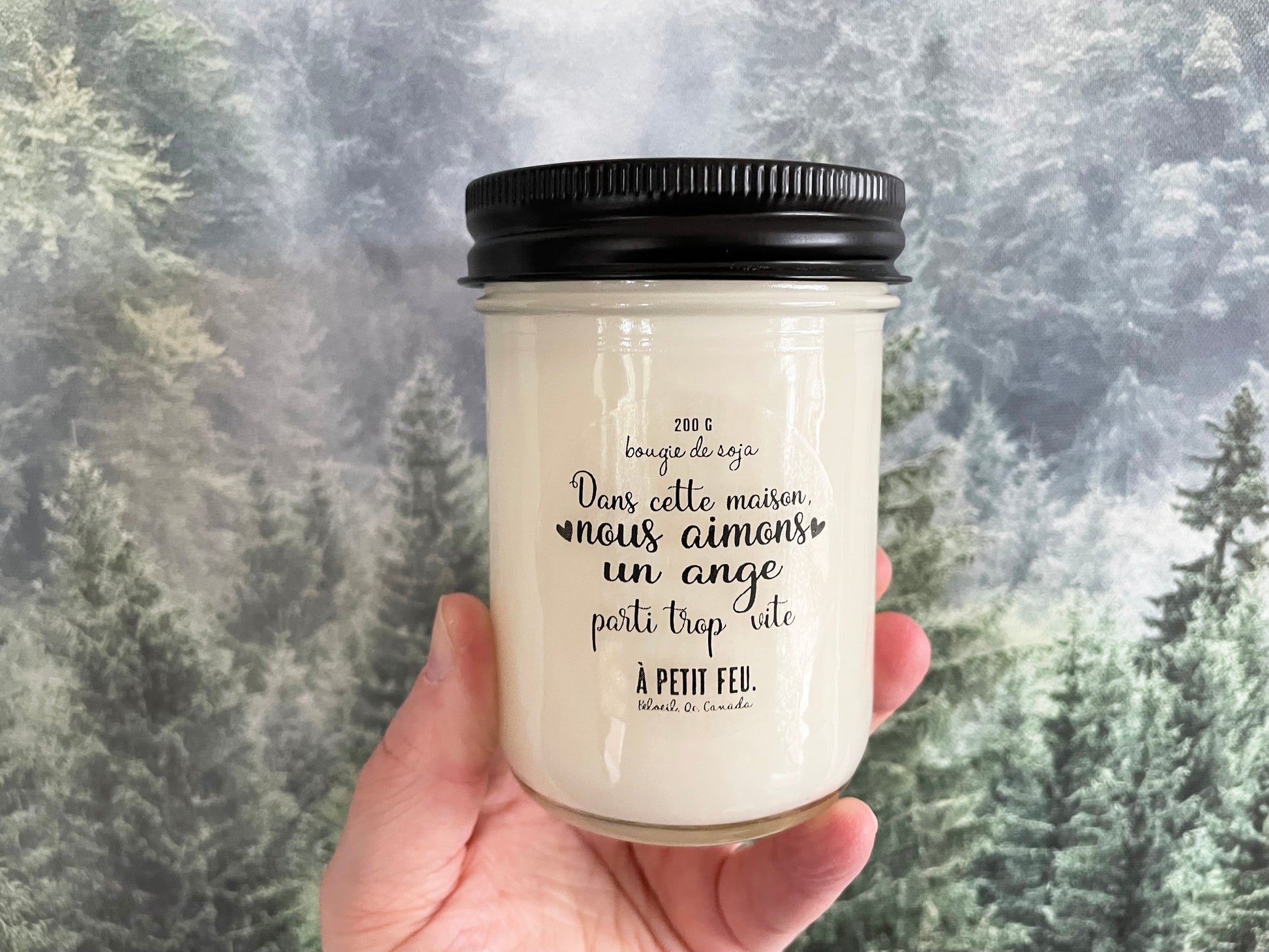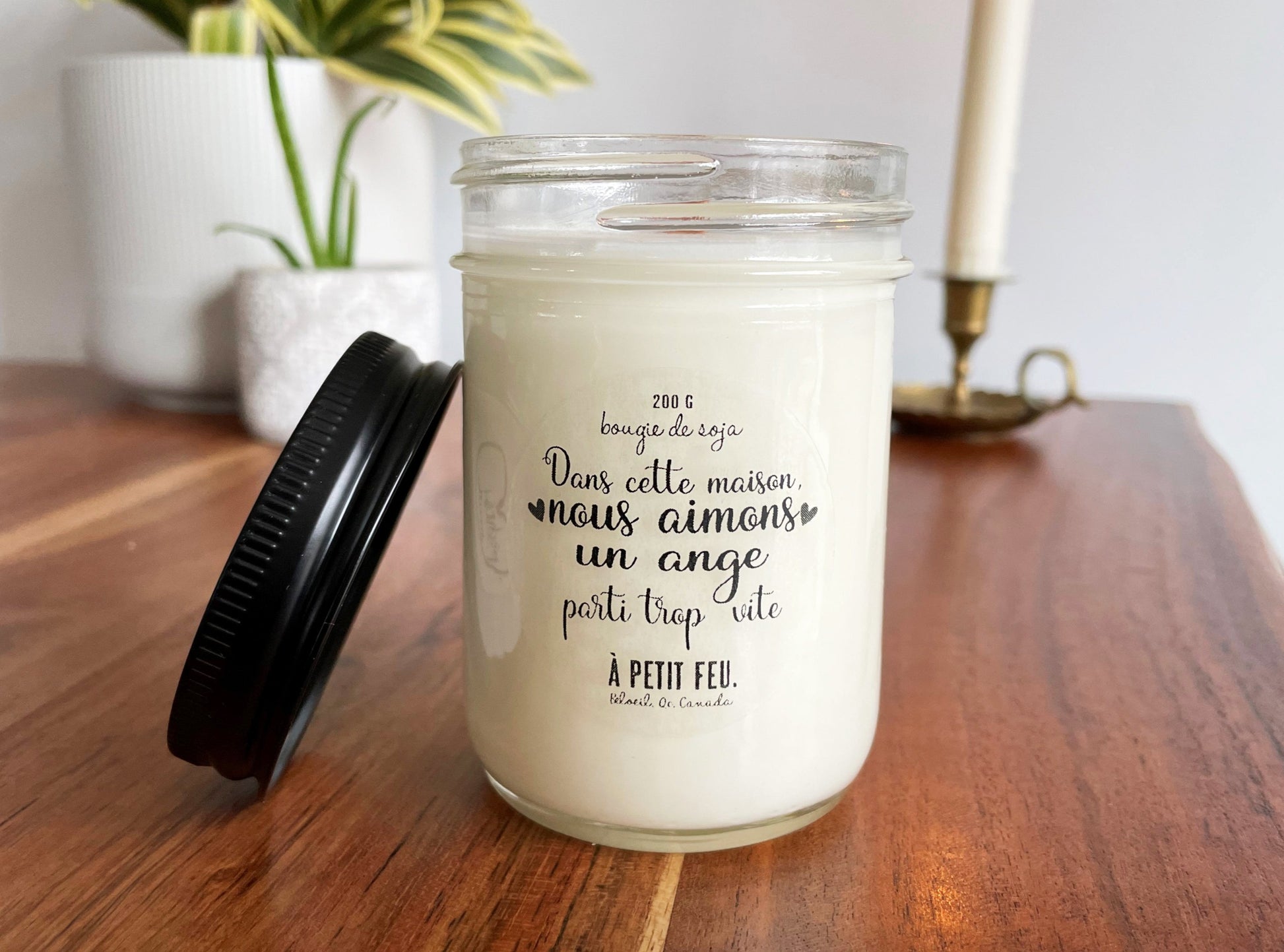 Cette chandelle artisanale est fait avec de la cire de soya sans émanations toxiques. Sans danger pour l'environnement, cette cire provient d'une source renouvelable et durable. Les chandelles fabriquées avec de la cire de soya brûlent jusqu'à 50% plus longtemps que les chandelles à base de cire de paraffine.