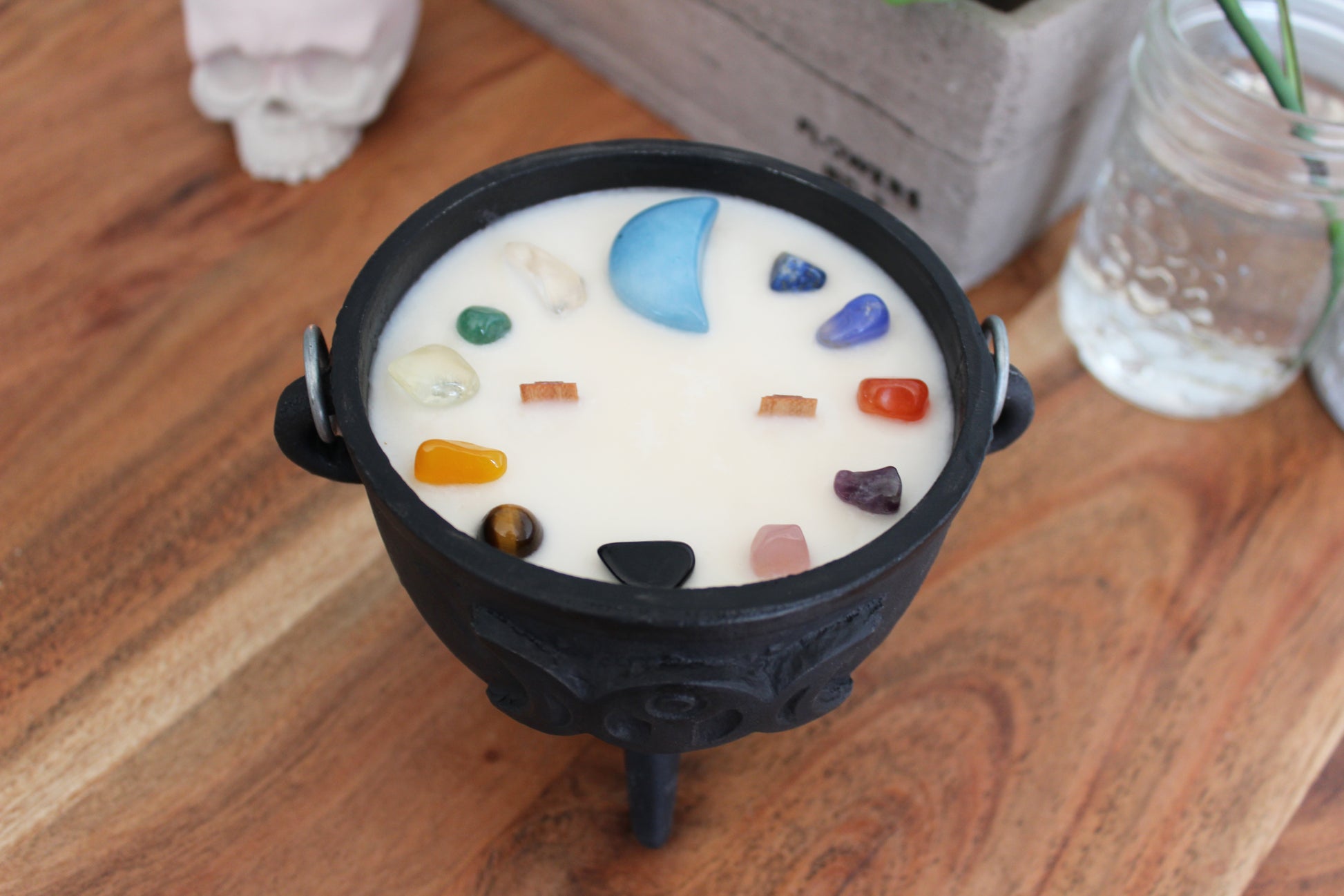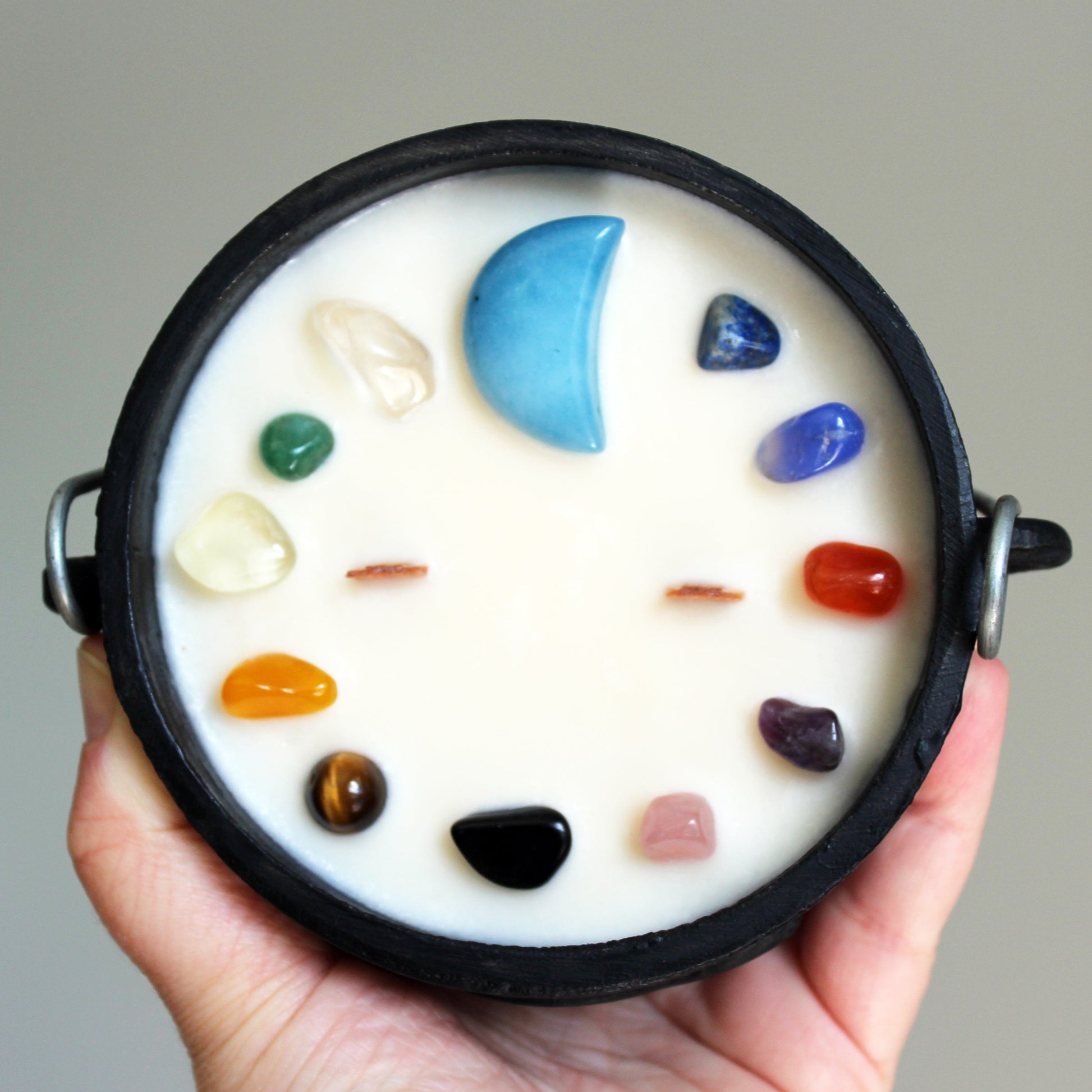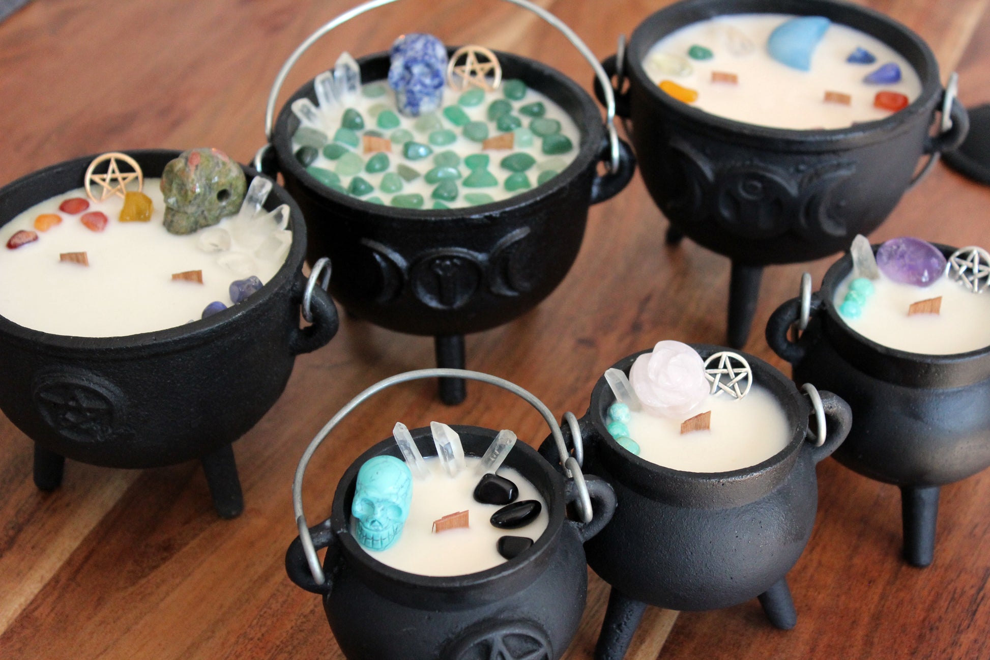 Les petites marmites sont de petits chaudrons en fonte et viennent avec un couvercle. Lorsque la bougie est terminé, vous pouvez réutiliser la marmite pour y faire bruler de l'encens et garder les pierres pour votre collection.
