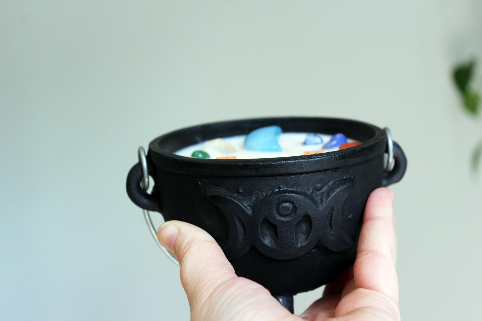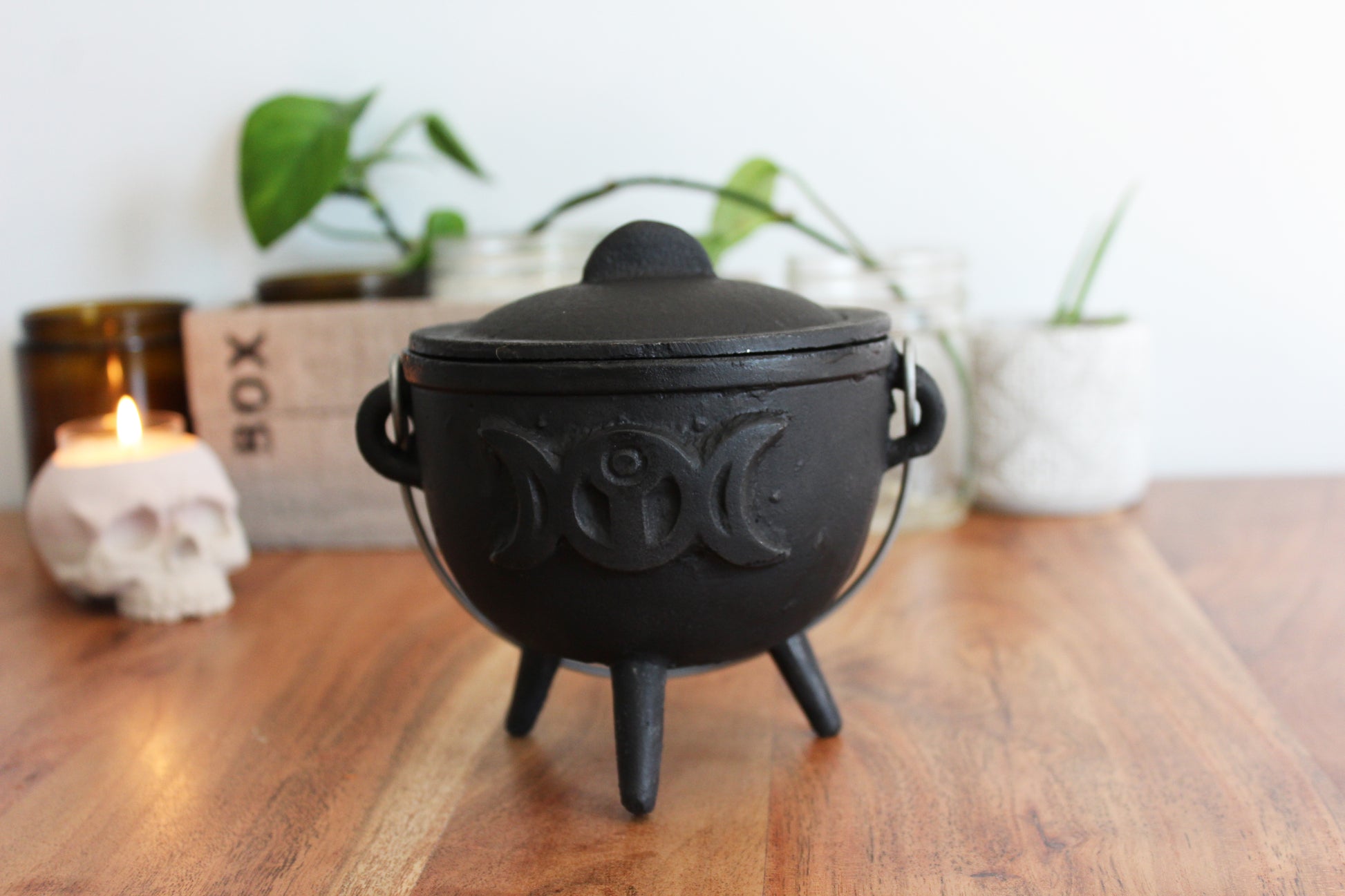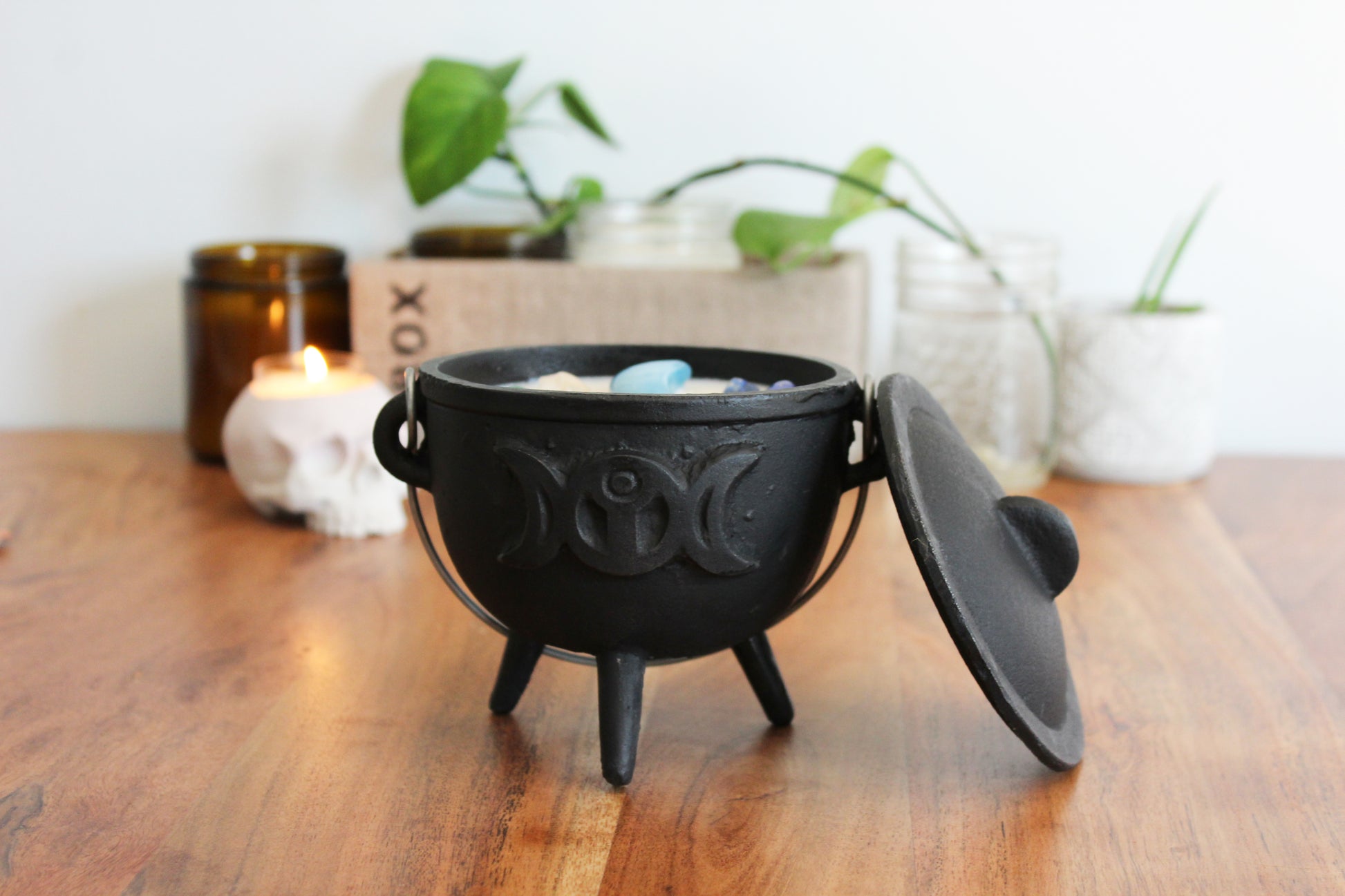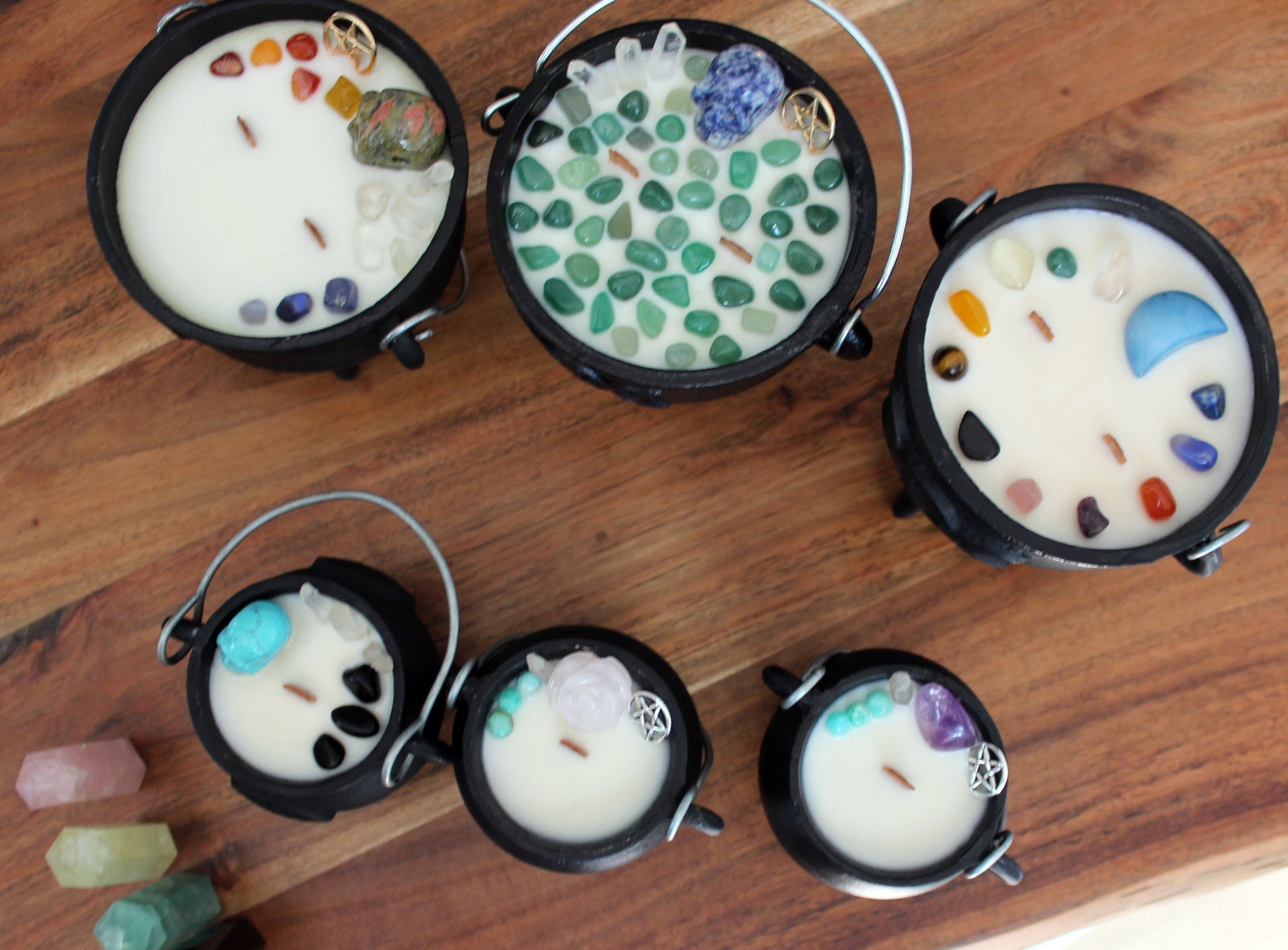 Les petites marmites sont de petits chaudrons en fonte et viennent avec un couvercle. Lorsque la bougie est terminé, vous pouvez réutiliser la marmite pour y faire bruler de l'encens et garder les pierres pour votre collection.
