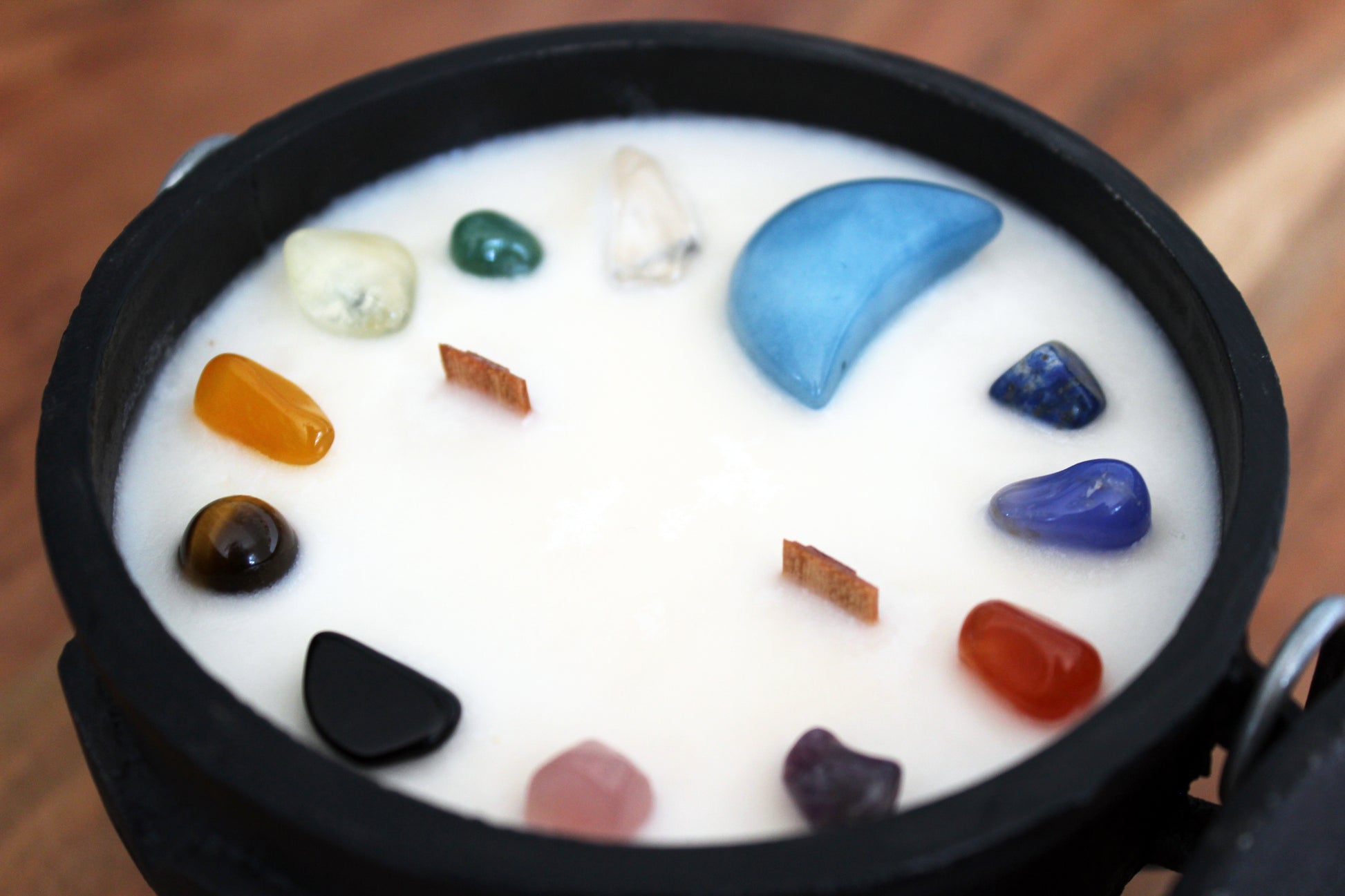 La bougie de soja avec mèches de bois est surmontées de pierres semi-précieuse : La bougie vient agrémenté de petite cristaux colorés ( Pierre Améthyste Cristal Quartz, cyprine, obsidienne, aventurine, œil de tigre, agate, jaspe ) et d'une lune taillée dans une pierre d'aqua marine.