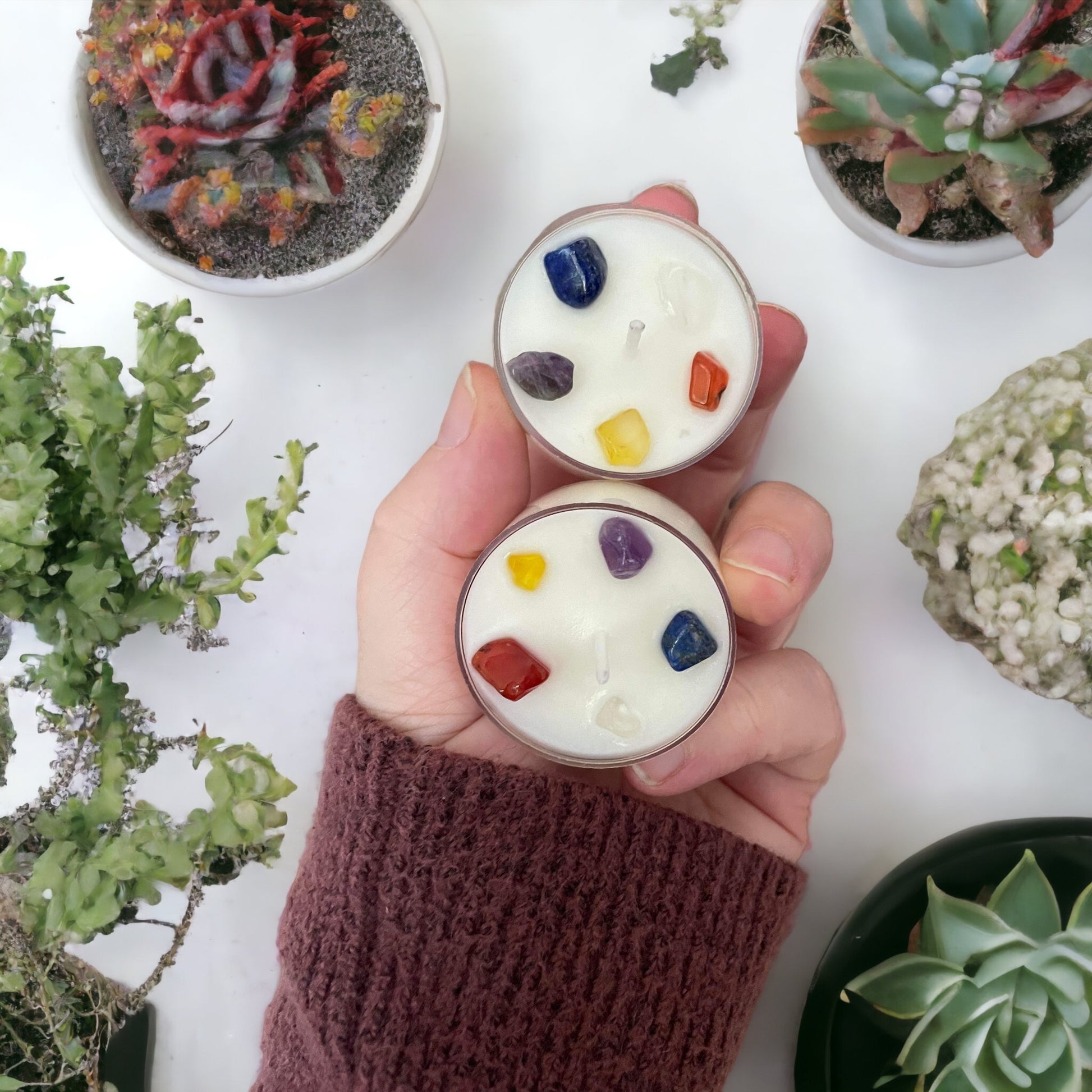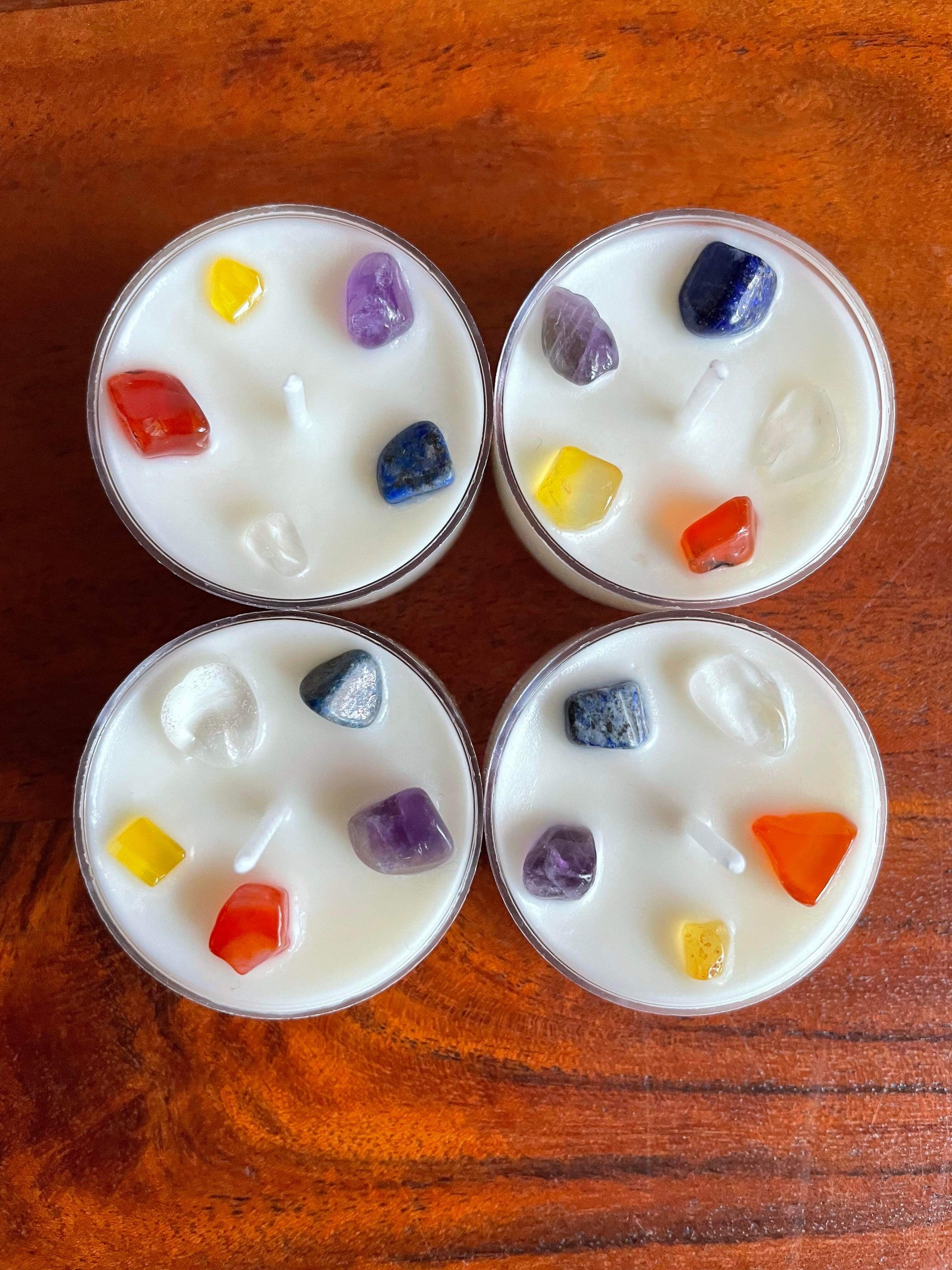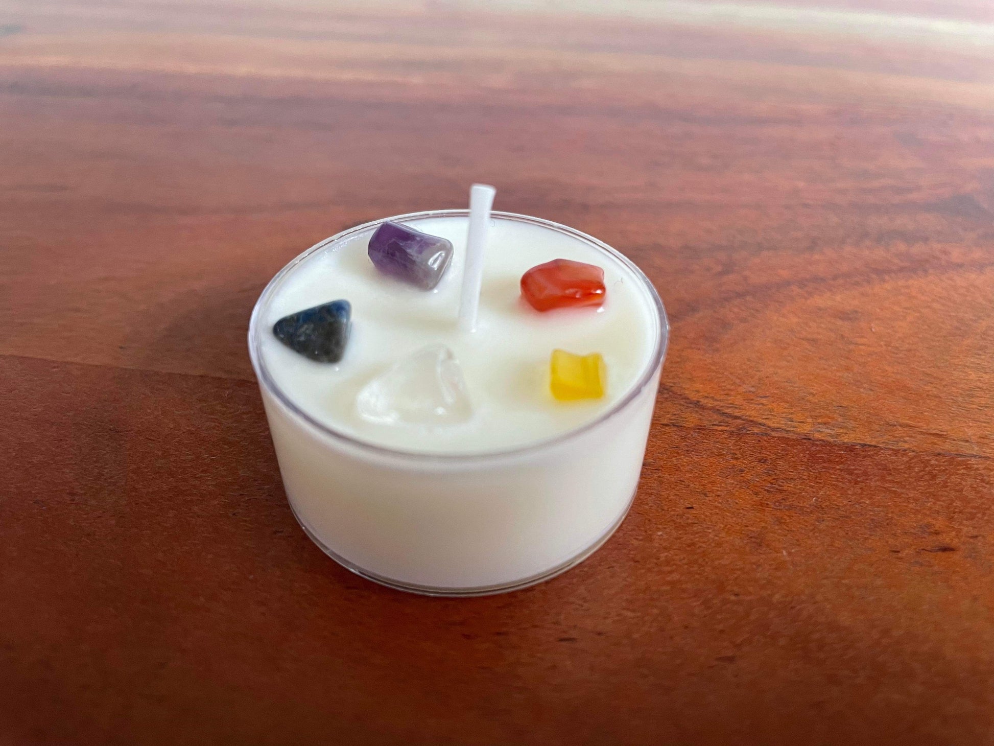 La bougie vient agrémenté de petite cristaux colorés ( Pierre Améthyste Cristal Quartz, opales, lapis lazuli).