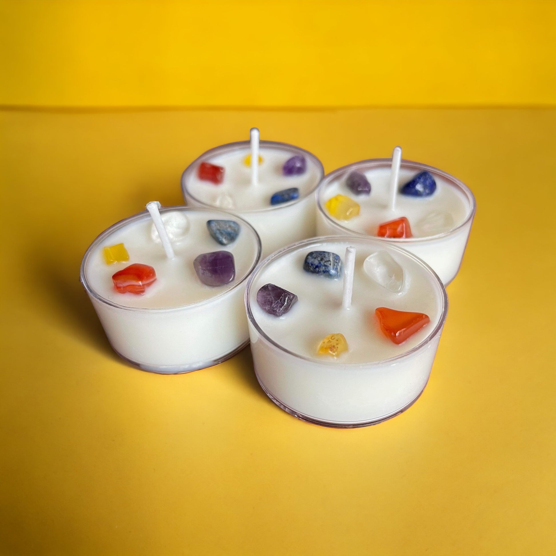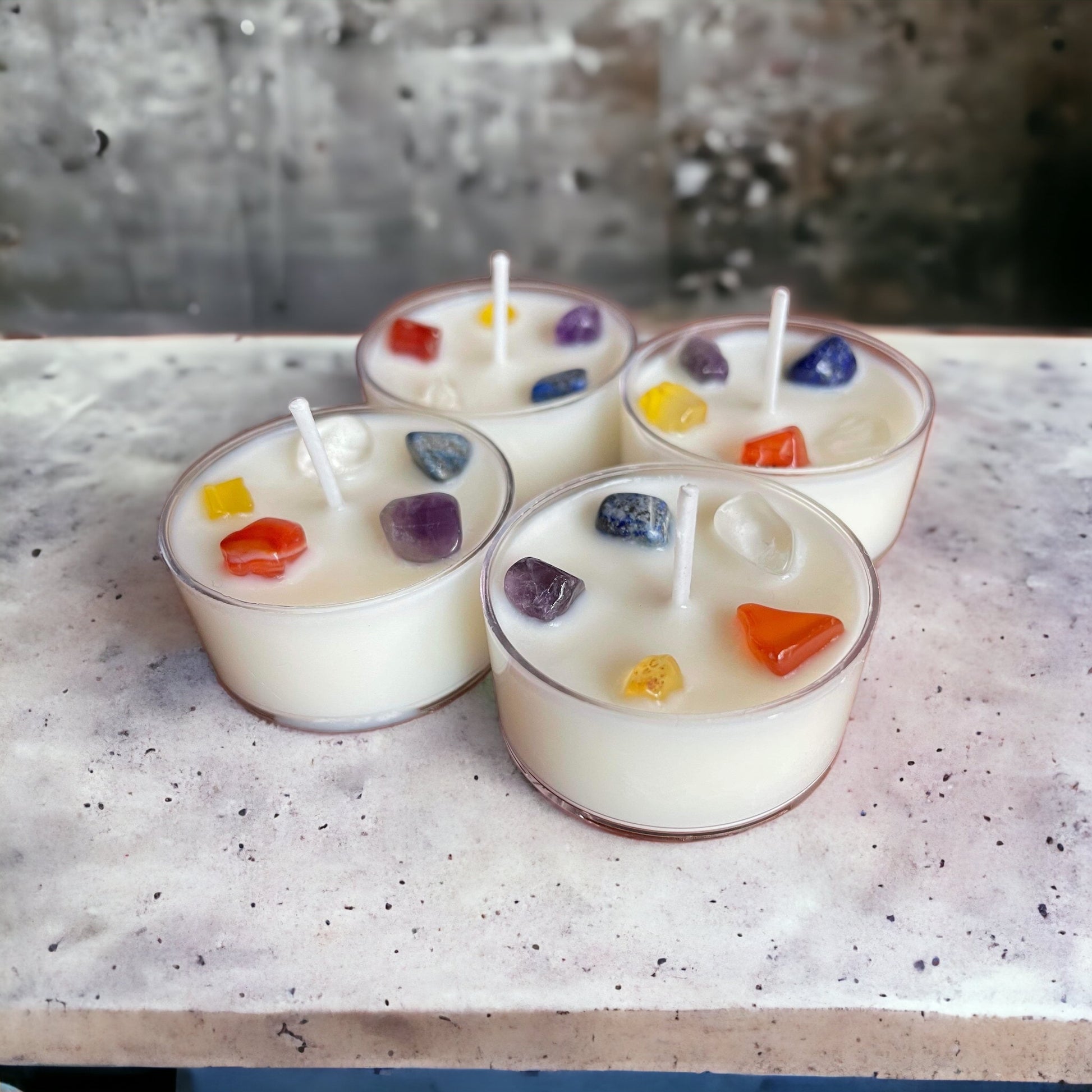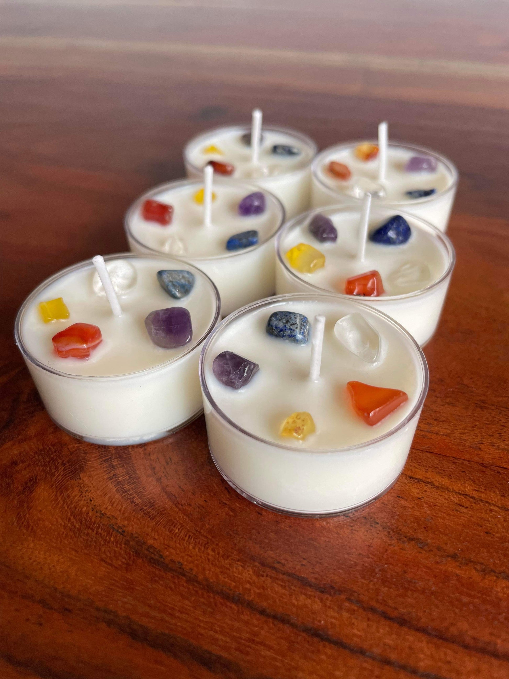 La bougie vient agrémenté de petite cristaux colorés ( Pierre Améthyste Cristal Quartz, opales, lapis lazuli).
