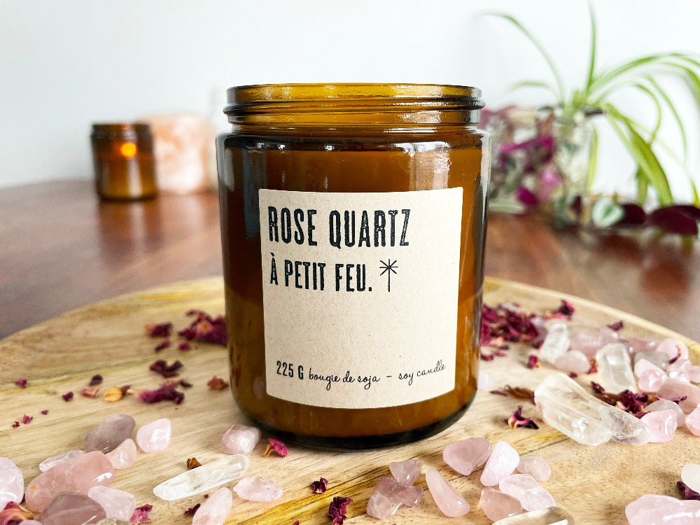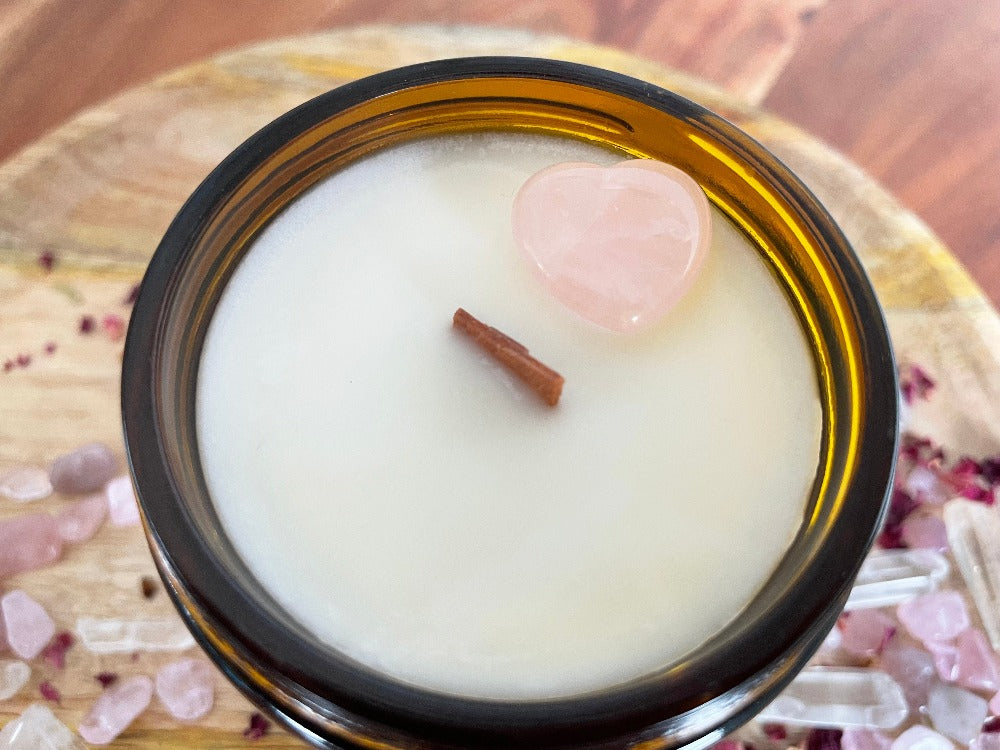 Cette bougie de soja avec mèche de bois est décorée d'une pierre de quartz en forme de cœur.