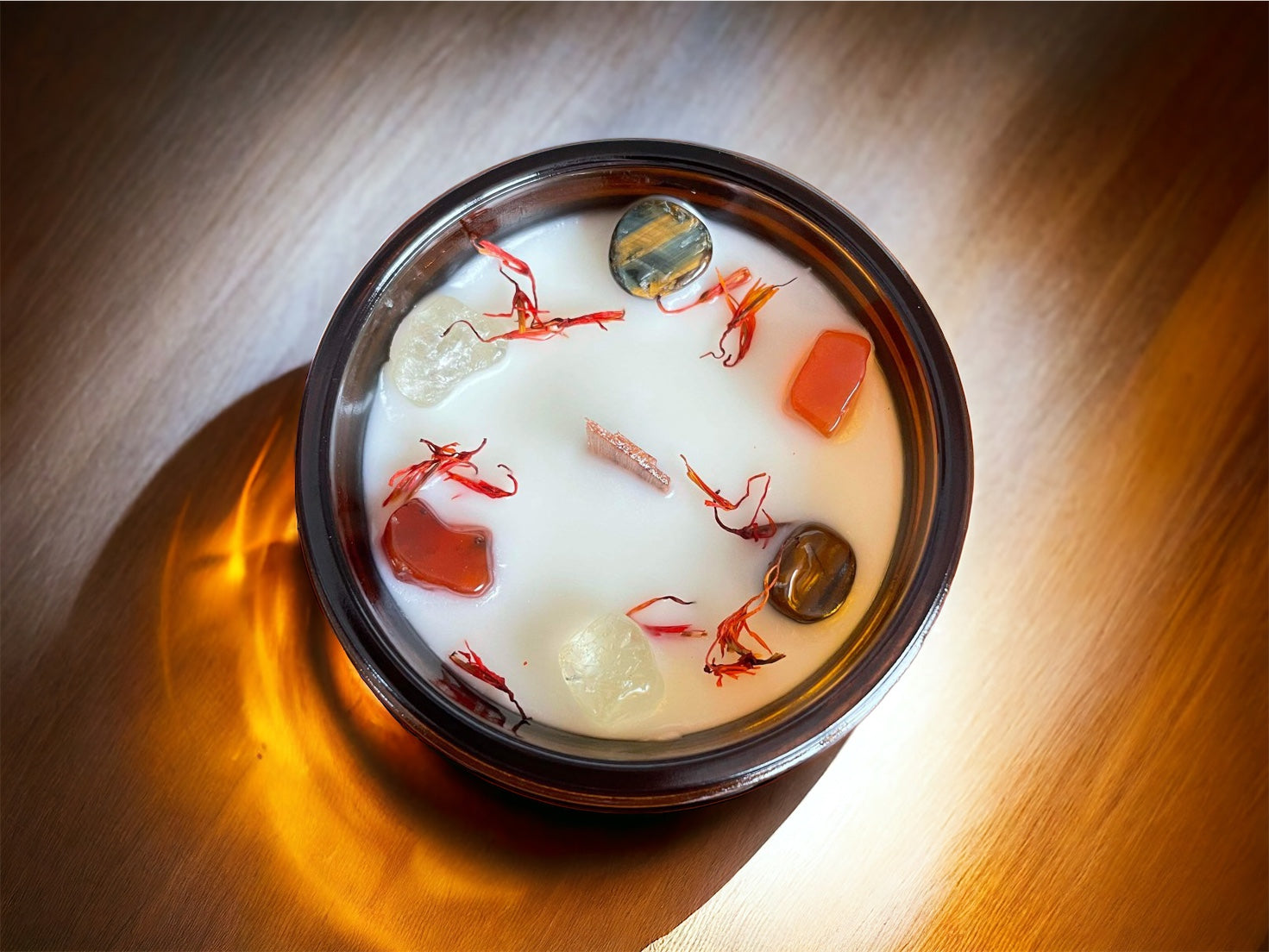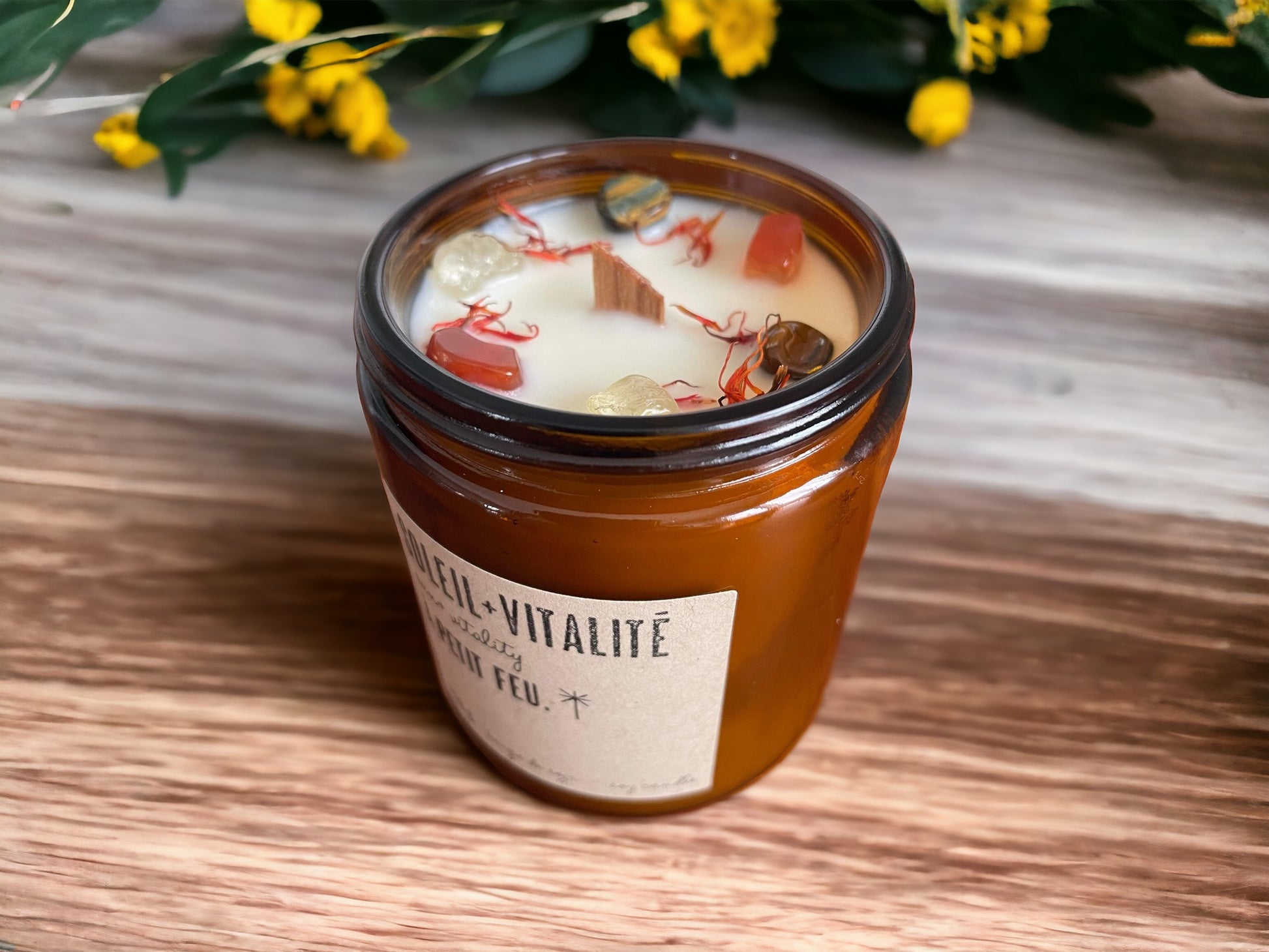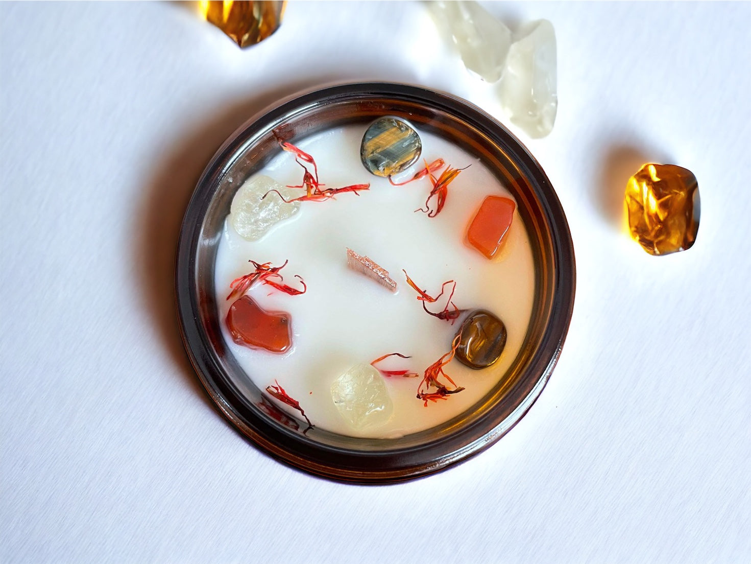 Cette bougie a été créé dans l’intention de vous aider à vous reconnecter à l'énergie solaire et à votre vitalité. Décorée de citrine, œil de tigre et d'opale colorée! Elle est aussi saupoudrée et de safran, symbole de vie.
