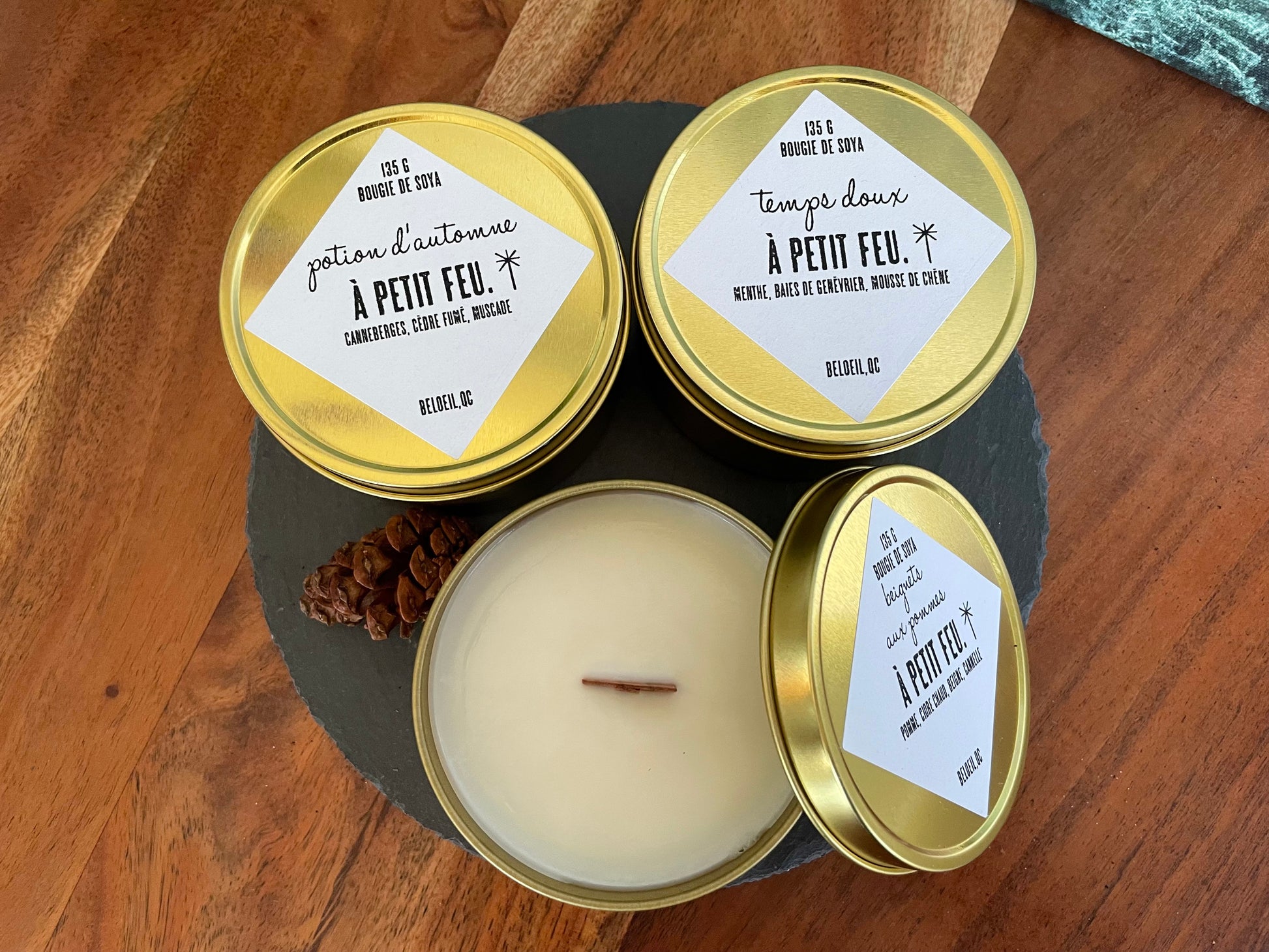Avec ce trio de bougies de soja avec mèche de bois crépitante, découvrez nos nouveaux parfums : Temps doux, Potion d'automne et beignets aux pommes!